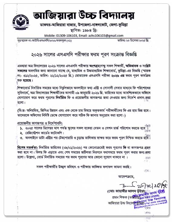 শিক্ষাবোর্ড নির্ধারিত সময়ের মধ্যে নির্ভুলভাবে অনলাইনে তথ্য এন্ট্রি ও সোনালী সেবার মাধ্যমে ফি পরিশোধের সুবিধার্থে, অত্র বিদ্যালয়ের শিক্ষার্থীদের আগামী ০৯ জানুয়ারি ২০২৬ খ্রি. তারিখের মধ্যে আবশ্যিকভাবে অফিসে যোগাযোগ করে ফরম পূরণের নির্ধারিত ফি ও প্রয়োজনীয় কাগজপত্র জমা দেওয়ার জন্য নির্দেশ প্রদান করা হলো।